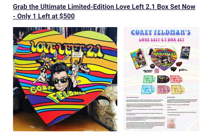 ONLY 1 REMAINING LOVE LEFT 2.1 BOXSET REMAINING! Grab the Ultimate Limited-Edition Love Left 2.1 Box Set Now – Only 1 Left at $500 Corey Feldman’s Love Left 2.1 box set is now available for a limited time only at the unbeatable price of $500. Don’t miss your chance to grab this one-of-a-kind collector’s item before it’s gone forever.